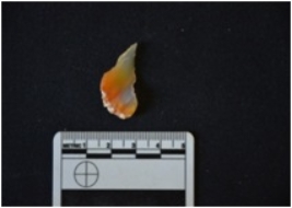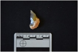 | Description / विवरण | Chert utilized flake has a midridge on dorsal side, striking platform, bulb on ventral side and use-wear marks on working edge. |
