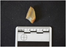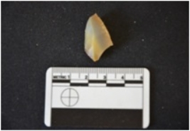 | Description / विवरण | Chalcedony utilized flake has a ridge on dorsal side, striking platform, diffused bulb on ventral side, use-wear marks on working edge and raw-material given heat treatment. |