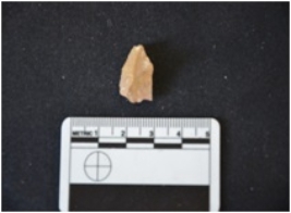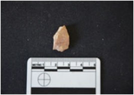 | Description / विवरण | Chert utilized flake has flake scars on dorsal side, striking platform, bulb on ventral side and use-wear marks on working edge. |