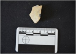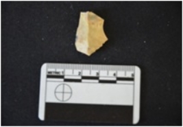 | Description / विवरण | Chert utilized flake has a ridge on dorsal side, striking platform, bulb on ventral side, broken from distal end and use-wear marks on working edge. |