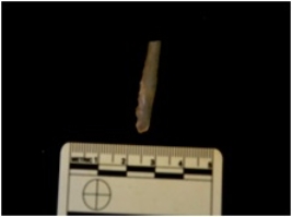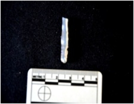 | Description / विवरण | Blade made on chalcedony, use wear marks along both edges, retouch marks along one edge, bulb of percussion visible |