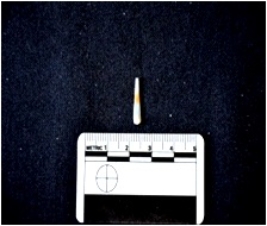 | Description / विवरण | Blade made on chalcedony, use wear marks on one edge an broken along the other |