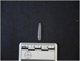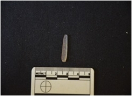 | Description / विवरण | Blade made on chalcedony, use wear marks along both edges, mid-ridge on dorsal side |