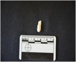 | Description / विवरण | Blade made on chert, broken at the distal end, mid-ridge seen on the dorsal end, bulb of percussion visible |