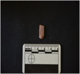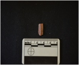 | Description / विवरण | Blade made on chert, use wear marks along both edges, broken at the distal end, bulb of percussion visible |