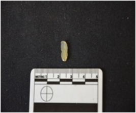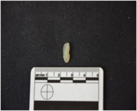 | Description / विवरण | Blade made on chalcedony, use wear marks along both edges, bulb of percussion visible |