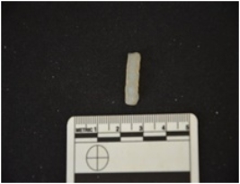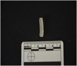 | Description / विवरण | Blade made on chalcedony, use wear marks along both edges, broken at the distal end, bulb of percussion visible |