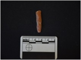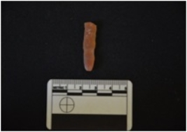 | Description / विवरण | Agate blade fragment has flake scars on dorsal side, striking platform, bulb with errailure on ventral side, broken from distal end, trapezoidal cross-section and use-wear marks on cutting edges. |
