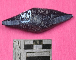 | Description / विवरण | A bone point. It is pointed from both the ends and has irregular shape. Its color is black with smooth surface. |