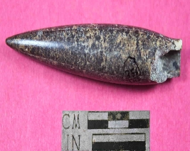 | Description / विवरण | A conical shaped bone point showing pointed on one end and partly broken from another end. Its color is dark brown and has smooth surface. |