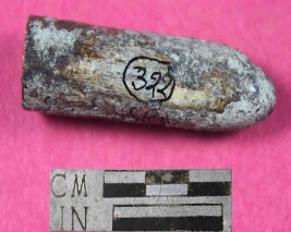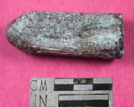 | Description / विवरण | A conical shaped bone point showing pointed on one end and partly broken from other side.Its color is light brown and has rough surface. |