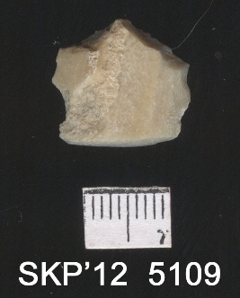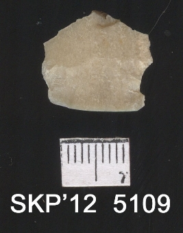 | Description / विवरण | This is a fragment of a chert blade, broken at almost all the sides, with one end showing a trapezium cross section and flaked surface on the dorsal side. Which is barely visible due to the damaged surface |