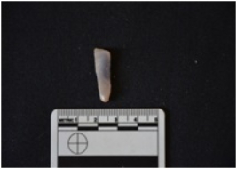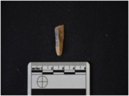 | Description / विवरण | Chert blade fragment has a midridge on dorsal side, striking platform, bulb on ventral side, broken from distal end, triangular cross-section and use-wear marks on cutting edges. |