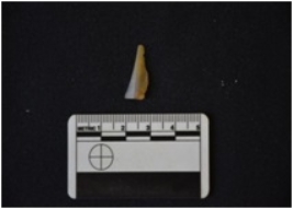 | Description / विवरण | Chalcedony blade fragment has two ridges on dorsal side, striking platform, diffused bulb on ventral side, narrow from distal end, use-wear marks on cutting edges and trapezoidal cross-section. |