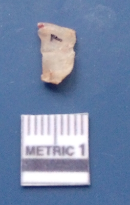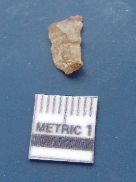 | Description / विवरण | It is a blade fragment. The ridges and the flake scars are clearly seen on the dorsal surface while the ventral surface is plain. The lateral sides are sharp and it is pale white in colour. It is trapezoidal in cross - section. |