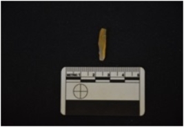 | Description / विवरण | Chalcedony blade fragment has ridge on dorsal side, striking platform, bulb on ventral side, broken from distal end and retouches on cutting edge. |
