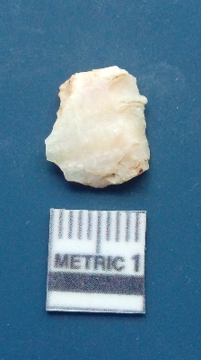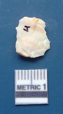 | Description / विवरण | It is a flake. The flake scars are clearly seen on the dorsal surface while the ventral surface is plain. The lateral sides are sharp and it is creamish in colour. |
