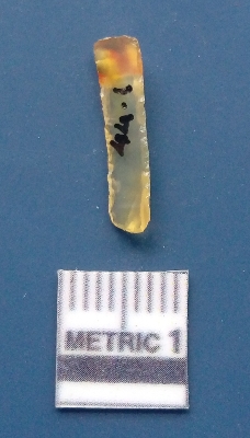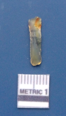 | Description / विवरण | It is a blade fragment. The ridges and flake scars are clearly seen on the dorsal surface while the ventral surface is plain. The lateral sides are sharp and it is white in colour. It is triangular in cross - section. |