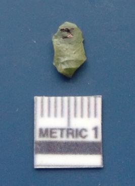 | Description / विवरण | It is a blade fragment. The ridges and flake scars are clearly seen on the dorsal surface while the ventral surface is plain. The lateral sides are sharp and it is greenish in colour. It is triangular in cross - section. |