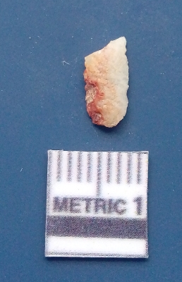 | Description / विवरण | It is a blade fragment. The ridges and flake scars are clearly seen on the dorsal surface while the ventral surface is plain. The lateral sides are sharp and it is orangish white in colour. It is triangular in cross - section. |