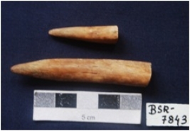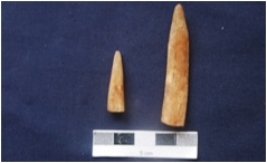 | Description / विवरण | Pointed on one end and thicker on the other end. Rough elliptical in cross section. The other piece is same but smaller. |