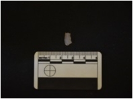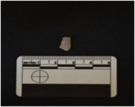 | Description / विवरण | Chalcedony blade fragment has ridges on dorsal side, striking platform, diffused bulb on ventral side, broken from distal end, use-wear marks on cutting edges and trapezoidal cross-section. |