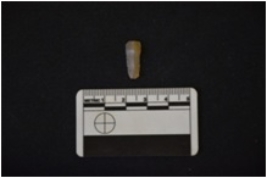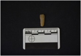 | Description / विवरण | Chalcedony blade fragment has a midridge on dorsal side, striking platform, bulb on ventral side, broken from distal end, use-wear marks on cutting edges and triangular cross-section. |