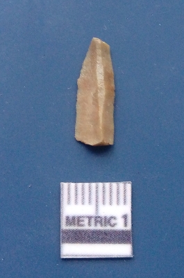 | Description / विवरण | It is a blade fragment. The ridges are clearly seen on the dorsal surface while the ventral surface is plain. It is light brownish in colour. It is riangular in cross - section. |