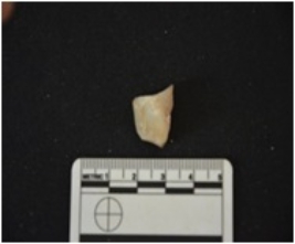 | Description / विवरण | Fragment of a blade made on chert, broken from the distal side, bulb of percussion visible |