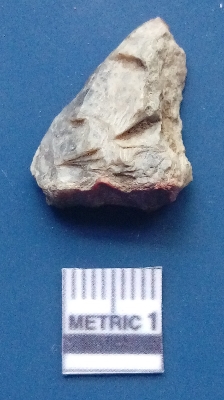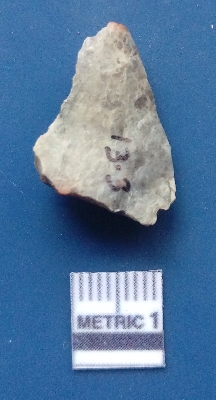 | Description / विवरण | It is a blade fragment. The ridges are clearly seen on the dorsal surface while the ventral surface is plain. It is greyish in colour. The sides are sharp and retouched. The striking platform is clearly seen. |