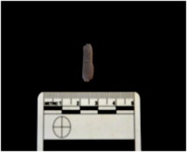| Description / विवरण | Blade made on chalcedony, use wear marks along one ege, bulb of percussion visible, broken along the distal end |