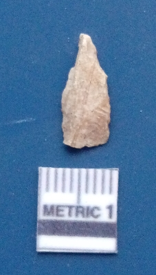 | Description / विवरण | It is a blade fragment. The ridges are clearly seen on the dorsal surface while the ventral surface is plain. It is yellowish in colour. The sides are sharp and retouched. |
