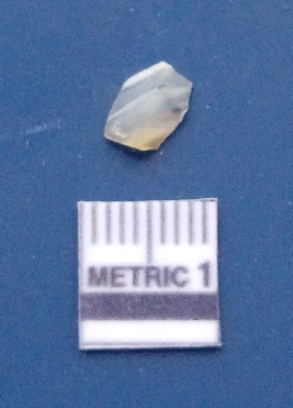 | Description / विवरण | It is a blade fragment. The ridges are clearly seen on the dorsal surface while the ventral surface is plain. It is white in colour. The sides are sharp and retouched. |