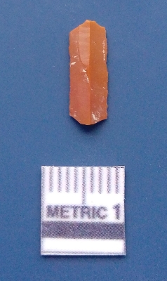 | Description / विवरण | It is a blade fragment. The ridges are clearly seen on the dorsal surface while the ventral surface is plain. It is brownish in colour. The sides are sharp and retouched. It is triangular in cross - section. |