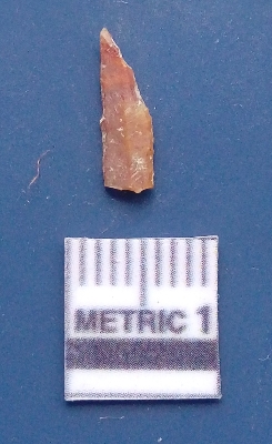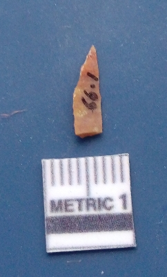 | Description / विवरण | It is a blade fragment. The ridges are clearly seen on the dorsal surface while the ventral surface is plain. It is brownish in colour. The sides are sharp and the soil incrustations are clearly seen. It is trapezoidal in cross - section. |