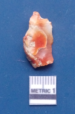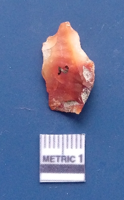 | Description / विवरण | It is a blade fragment. The ridges are clearly seen on the dorsal surface while the ventral surface is plain. It is orangish in colour. The sides are sharp and the soil incrustations are clearly seen. |
