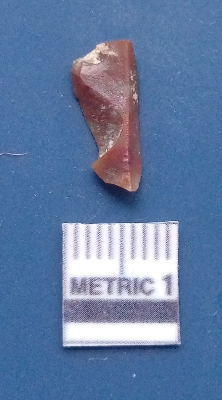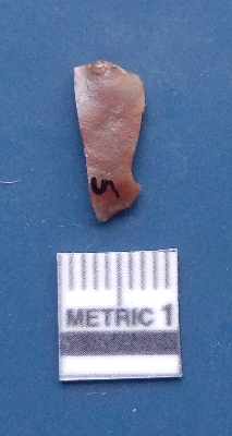 | Description / विवरण | It is a blade fragment. The idges are clearly seen on the dorsal surface while the ventral surface is plain. It isb rownish in colour. The sides are sharp and the bulb of percussion is clearly seen. |