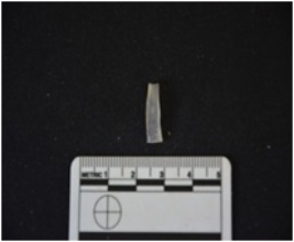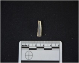 | Description / विवरण | Blade made on chalcedony, use wear marks along both edges, broken at the proximal end |