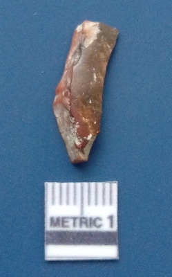 | Description / विवरण | It is a blade fragment. The ridges are clearly seen on the dorsal surface while the ventral surface is plain. It is brownish in colour. The sides are sharp and it is trapezoidal in cross - section. |