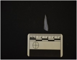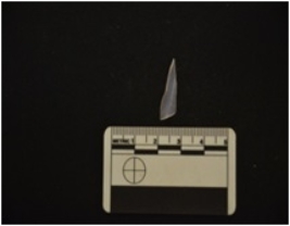 | Description / विवरण | Blade made on chalcedony, broken along one edge, use wear marks on both edges |