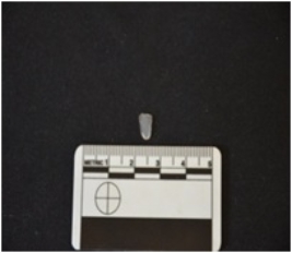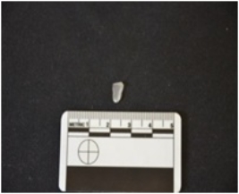 | Description / विवरण | Fragment of a blade made on chalcedony, use wear marks along both edges, broken at the distal end, bulb of percussion visible |