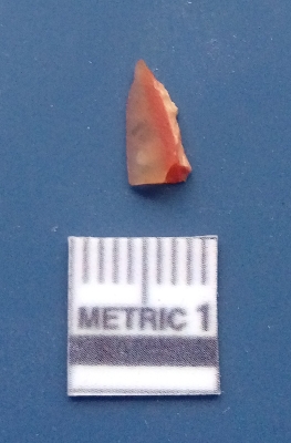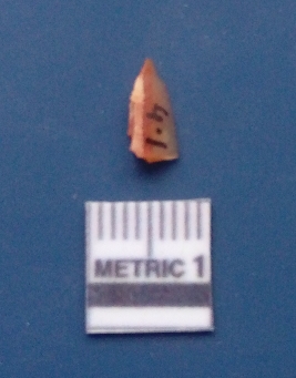 | Description / विवरण | It is a blade fragment. The ridges are clearly seen on the dorsal surface while the ventral surface is plain. It is orangish in colour. The sides are sharp and it is triangular in cross - section. |