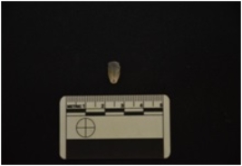 | Description / विवरण | Chalcedony blade fragment has two ridges on dorsal side, striking platform, bulb on ventral side, broken from distal end, trapezoidal cross-section and use-wear marks on cutting edges. |