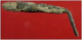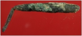 | Description / विवरण | Trench XAT 19, Qdt 1, layer 14, depth 445-470 cm It is an arrow head made of copper. It has a thin and bent point. Presence of patina with dust on it. |