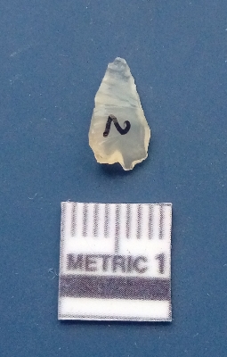 | Description / विवरण | It is a blade fragment. The ridges are clearly seen on the dorsal surface while the ventral surface is plain. It is white in colour. The sides are sharp and it is triangular in cross - section. |