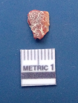 | Description / विवरण | It is a blade fragment. The ridges are clearly seen on the dorsal surface while the ventral surface is plain. It is brownish in colour. The sides are sharp and it is trapezoidal in cross - section. |