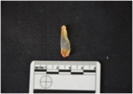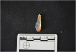 | Description / विवरण | Blunted Blade made on chalcedony, It has marks of flake scars on the dorsal surface and bulb of percussion on the ventral surface, one edge is blunt and other edge is very sharp. |