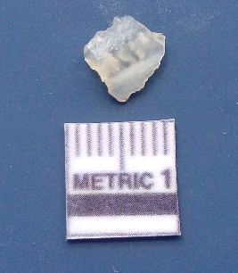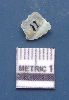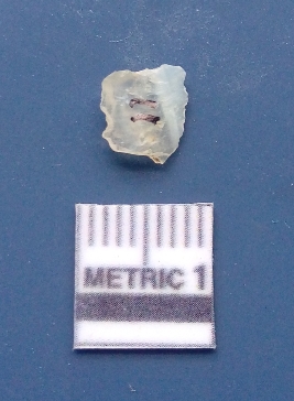 | Description / विवरण | It is a blade fragment. The ridges are clearly seen on the dorsal surface while the ventral surface is plain. It is white in colour. The sides are sharp and retouched. |