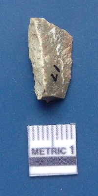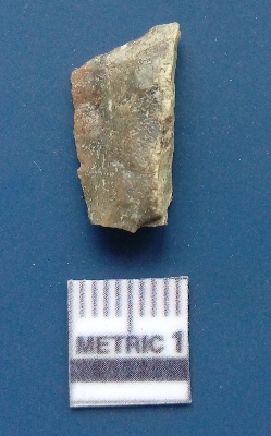 | Description / विवरण | It is a blade fragment. The ridges are clearly seen on the dorsal surface while the ventral surface is plain. It is brownish in colour. The sides are sharp and retouched. |