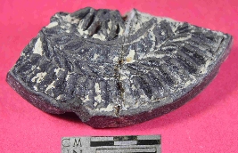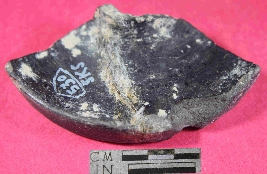 | Description / विवरण | A curved stamp with leaf pattern on it. It is in two pieces and mended. It has rough surface and its colour is black. |